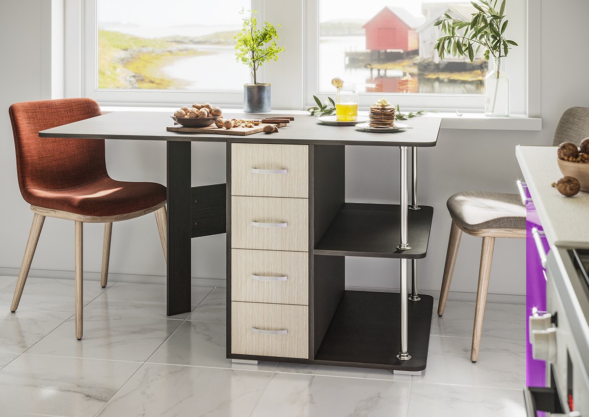 • С одной стороны стола находятся ящики для хранения, с другой – распашная створка, которую фиксирует "толкатель" (открывается при нажатии)